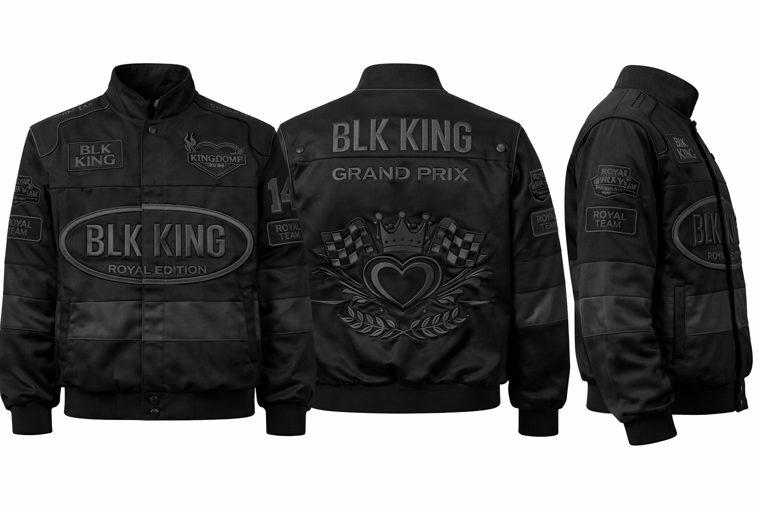 The BLK KING “Stealth King Circuit” All-Black RACECAR Jacket is made for men who don’t chase attention — they command it. This is the ultimate expression of quiet luxury motorsport: a fully tonal black-on-black design crafted with texture, depth, and power in every detail.